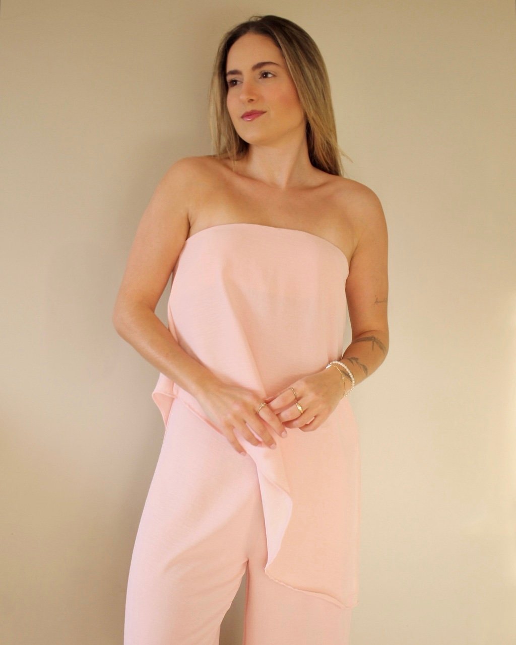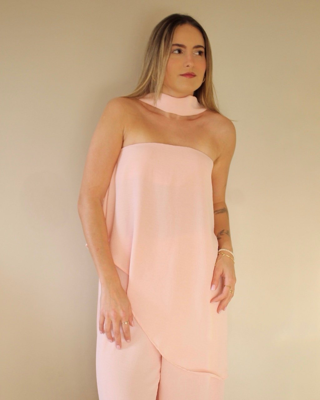 Conjunto Assimétrico Blusa Tomara Que Caia + Calça Pantalona + Tira de pescoço Rosa Bebê