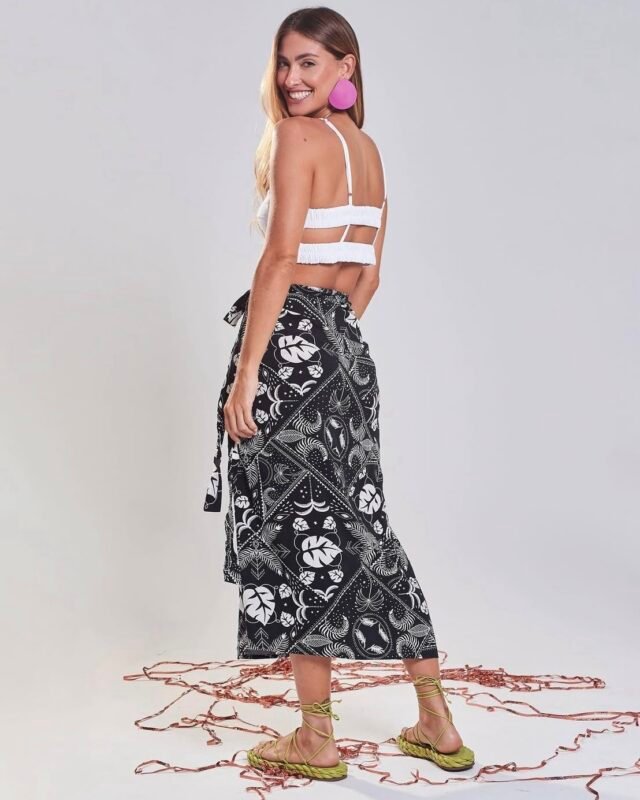 Com fenda lateral, tecido Amni e elástico na cintura, ela permite usar no cós alto ou baixo, sempre garantindo um caimento lindo.